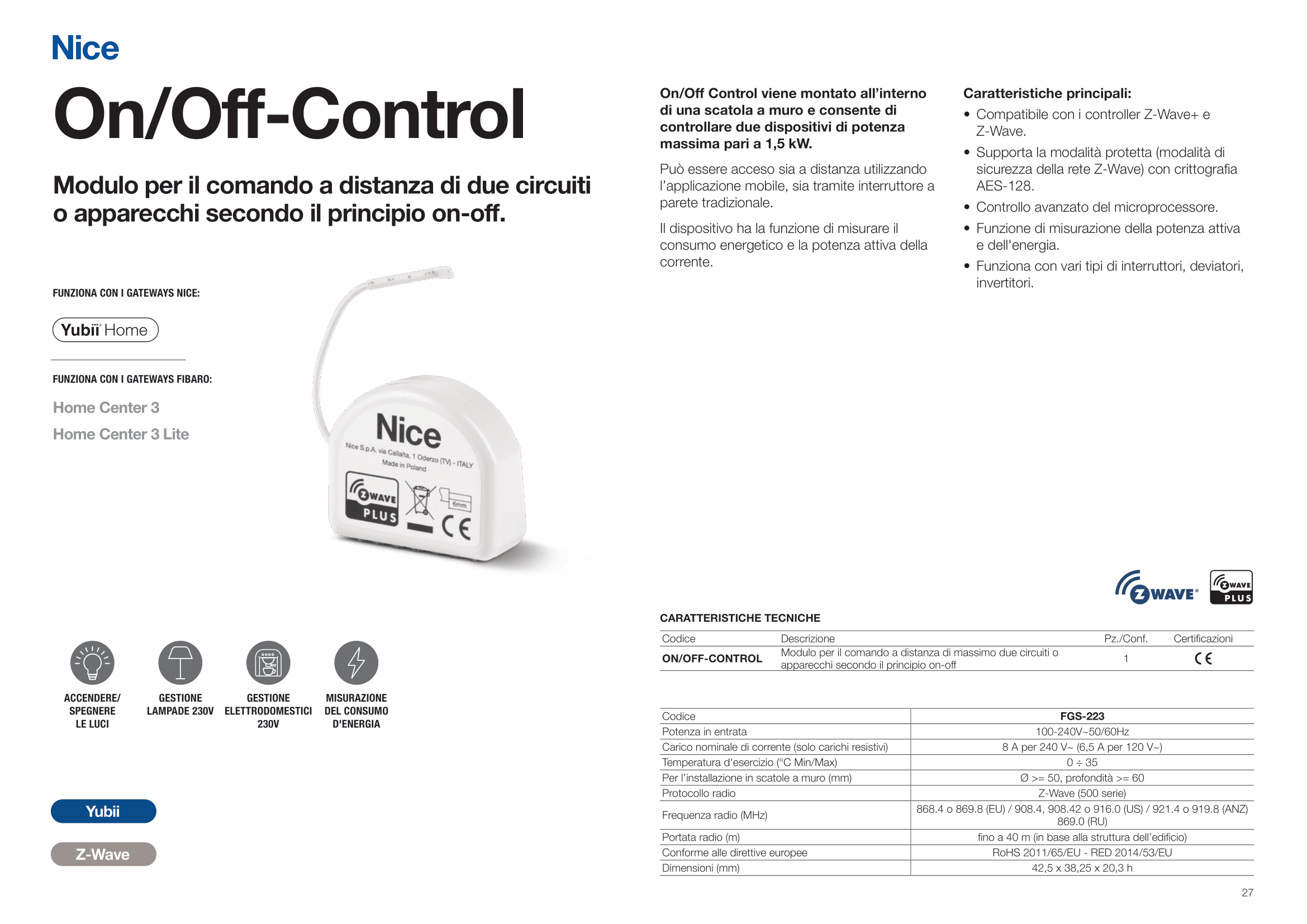 On/Off Control viene montato all’interno di una scatola a muro e consente di controllare due dispositivi di potenza massima pari a 1,5 kW.